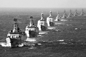 ——2002年5月至9月,中國海軍艦艇編隊首次環球航行,共穿越15條著名海峽水道,橫跨68個緯度,6次穿越赤道,訪問10個國家和港口,總航程33000海里。至此,中國海軍艦艇編隊壯游三大洋。同時,一個新的重大轉折也在悄然完成。軍艦走出國門,開始從單純航渡出訪,轉變為遠航訓練結合出訪,甚至是以訓練為主。征服遠海大洋的能力,體現著一支現代海軍的訓練水平。1980年10月,南海艦隊艦艇編隊,首次出巴林塘海峽到太平洋遠航訓練。經過海峽西口的“魔鬼三角洲”時,因缺乏經驗,一艘軍艦上的10名艦員被巨浪打下大海,2人遇難。這是人民海軍走向大洋付出的血的代價。此后,海軍遠航編隊經驗越來越豐富,不畏暗礁險灘,勇闖驚濤駭浪。在南中國海,戰艦遭遇狂風巨浪,重達1噸的鐵錨被風浪掀上甲板;在太平洋,編隊遭遇持續半個月之久的大風浪,滿載排水量為數萬噸的補給艦強烈震顫,逆風頂浪,頑強前進;在比斯開灣,編隊遭遇12級大風,艦體左右搖擺近30度,艦艉螺旋槳多次露出海面……20多年過去,人民海軍遠航訓練已經發展成為一種常態:每年有上百艘次水面艦艇駛向遠海大洋,晝夜連續航行從數百海里到數千海里,潛艇水下隱蔽待機由數十天到數月,航空兵長途奔襲由一般氣象條件到復雜氣象條件,上千艘次艦機在太平洋海域進行多課目訓練。