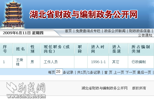 湖北省財政與編制政務(wù)公開網(wǎng)工作人員告訴記者,湖北省推行的是“陽光編制”,只要發(fā)生人事變更,該網(wǎng)便會在第一時間更新數(shù)據(jù)。11日上午10時,記者發(fā)稿前,王秉鋒的姓名仍掛在湖北省財政與編制政務(wù)公開網(wǎng)上,所屬單位為紅安縣國土資源局。(記者張揚(yáng))