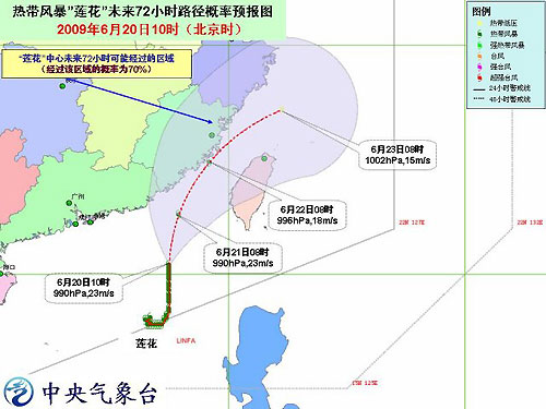 中新網6月20日電 中央氣象臺今天上午十時發布臺風橙色警報:今年第 3 號熱帶風暴“蓮花”( LINFA )的中心今天上午 10 時位于東沙島東偏南方大約 60 公里的南海北部海面上,就是北緯 20.5 度,東經 117.5 度,中心附近最大風力有 9 級( 23 米 / 秒)。