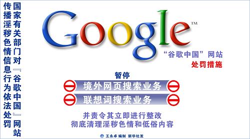 全國整治互聯網低俗之風辦公室19日向媒體透露,國家有關部門已經召見“谷歌中國”網站負責人,對該網站大量傳播淫穢色情內容進行執法談話,宣布暫停該網站境外網頁搜索業務和聯想詞搜索業務,并責令其立即進行整改,徹底清理淫穢色情和低俗內容。