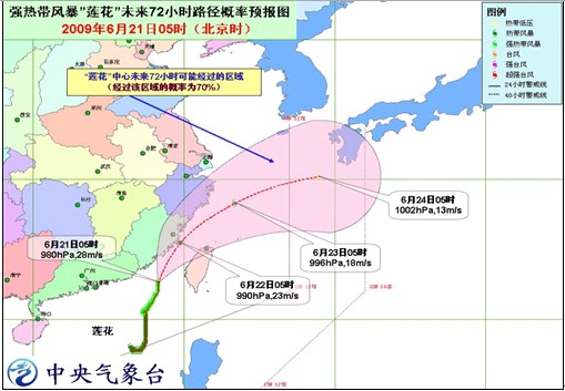 預計,“蓮花”將以每小時15公里左右的速度向北偏東方向移動,逐漸向福建福清到漳浦一帶沿海靠近,有可能于今天下午到夜間在這一帶沿海登陸;也有可能擦過福建省近海海面,沿臺灣海峽向東北方向移動,強度逐漸減弱。