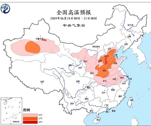 中新網6月24日電 據中國氣象局網站消息,今天白天,北京、天津、河北、河南以及山東等省成為太陽的重點“烘烤”對象,中央氣象臺今晨繼續發布高溫預報,預計上述地區今天的最高氣溫將到37~39℃,局地可達40℃。據中央臺專家介紹,這樣的高溫天氣會隨著一股南下的冷空氣,有望在26日結束。