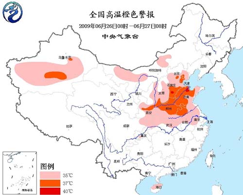中央氣象臺今天早晨六點鐘繼續發布高溫橙色警報:受大陸暖氣團影響,預計今天白天,華北大部、黃淮、江淮、江漢、陜西中部和東部、四川盆地東北部、內蒙古中西部、新疆南疆盆地等地有35℃以上的高溫天氣,其中,陜西中部、山西西南部、河北南部、京津地區、河南中東部、山東大部、安徽北部和南疆盆地等地的部分地區最高氣溫可達37~39℃,河北南部、山東北部局部地區氣溫可達40℃。