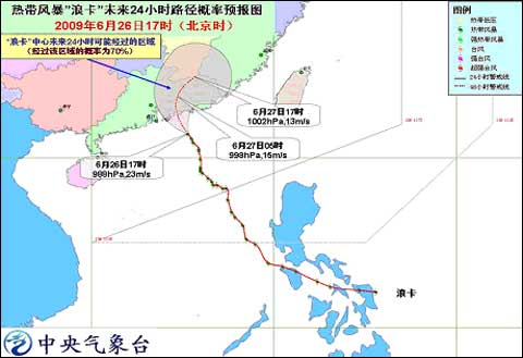 今年第4號熱帶風暴“浪卡”(NANGKA)的中心今天下午5時位于廣東省惠東縣南偏東大約140 公里的南海北部海面上,就是北緯21.4度、東經115.3 度,中心附近最大風力有9級(23米/秒)。