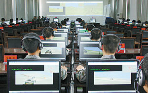 剛一進門,記者就聽到槍炮聲、戰車轟鳴聲交織在一起。百余名官兵頭戴耳機端坐在電腦前緊張操控著鼠標和鍵盤,前方大屏幕上顯示“紅軍”裝甲戰車正快速通過“藍軍”炮火攔阻區。