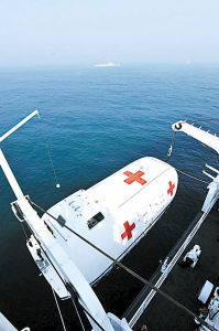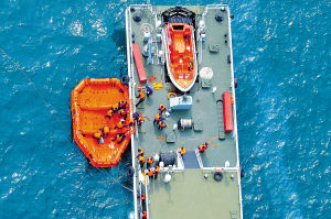 接到求救信號后,海上指揮所迅速派出各支救援分隊趕往事發海域。艦載救護直升機、海上傷員搜索定位裝置、拋射式救生索、救生吊桿、漂浮擔架、漂浮式救生網、救生浮臺、充氣滑梯等10多種新型海上醫療救護裝備紛紛亮相,大顯身手,上演了一幕幕扣人心弦的海上生命大救援。