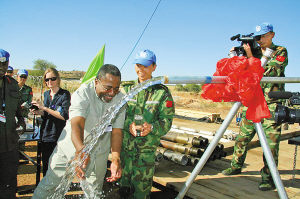 蘇丹是一個極度缺水的國家,常年動亂的一個重要原因就是爭奪水源。西方地質學家勘測后曾認定北部達爾富爾地區無地下水。北京軍區給水團維和官兵的主要任務是在這里進行水源勘察并構筑供水井,解決達爾富爾地區維和部隊及維和警察生活保障用水。去年10月16日上午,一股清泉從火成巖中噴涌而出,標志著我給水團官兵開創了聯合國維和部隊用水自給的先河,同時也書寫了我軍工兵首次在國外找水打井成功的歷史。