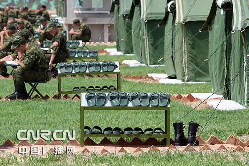 鳳凰衛(wèi)視記者:打靶歸來,第一件事情當然是洗澡,不過這樣赤條條穿過軍營,在中國記者眼中實在是過于自由散漫,看來紀律嚴明的俄羅斯大兵,訓練歸訓練,生活還是生活,由中方承建的俄軍野營村,規(guī)模不大,但功能齊全,熨斗、網吧、電話亭,各種生活設施一應俱全,面積達2750平方米的大食堂,每天都為1300名俄羅斯官兵,提供最地道俄式餐飲,雖然食物原料由中國制造,但17位廚娘清一色都來自俄羅斯,超市內琳瑯滿目,應有盡有,每一份商品都用中文和俄文注明詳細的價格,超市東西雖然便宜,還是要用人民幣來購買,所以俄羅斯士兵大都要到這里的貨幣兌換處來把手中的盧布換成人民幣,每100盧布,可以換19元人民幣。兌換處經常大排長龍,但精通俄語的中方工作人員就說,開業(yè)一周以來,這里每天的交易額只是3萬盧布,折合人民幣6300元平均每人每天才兌換5塊錢,不知道是俄軍待遇差,還是俄羅斯經濟衰退的緣故呢?