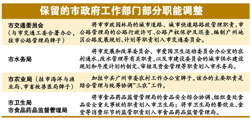 此輪改革中涉及調(diào)整、撤并的機(jī)構(gòu)共有29個(gè)。調(diào)整后,廣州市政府工作部門和辦事機(jī)構(gòu)從49個(gè)精簡(jiǎn)為40個(gè)。此外,設(shè)部門管理機(jī)構(gòu)2個(gè):廣州市勞動(dòng)教養(yǎng)工作管理局和廣州市城市管理綜合執(zhí)法局。現(xiàn)有的市政府派出機(jī)構(gòu)將保留4個(gè)撤銷1個(gè)。