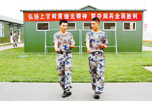 在方隊,易治安和武龍相處時間最長,訓在一起、吃在一桌、睡在一屋,基本上形影不離。久而久之,彼此心領神會。武龍說:“我們倆散步其實都是在以步代車進行模擬訓練。易班長往往會突然間加大步子,暗示我‘加速’,我就會在最短的時間內跟上。他習慣把訓練中的配合帶到生活中讓我體會,從而達到密切協同。”說起他倆的默契,同室戰友笑著說:“他們倆睡上下鋪,晚上打呼嚕都一致!”
