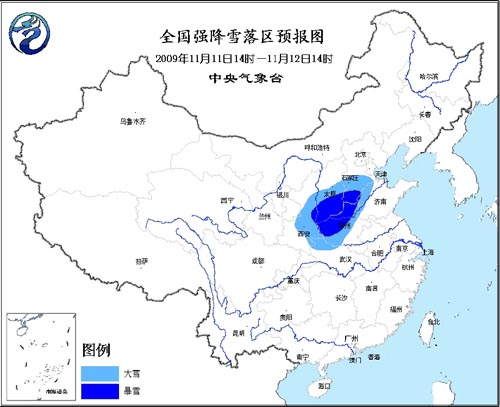中新網11月11日電 中央氣象臺11日10時發布暴雪橙色警報:受冷暖空氣的共同影響,預計今天下午到明天中午,陜西中部、山西中南部、河北中南部、河南北部和西部、湖北西北部、山東西北部等地有大雪,其中,陜西中部的局部地區、山西南部、河北南部、河南北部等地有暴雪,降水量一般有8~16毫米,局地達20毫米以上。