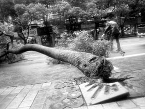 據(jù)市園林綠化局工作人員介紹,這棵樹有20年樹齡。從現(xiàn)場樹叉墜落方位及樹皮來看,這棵大樹曾受到多次撞擊,所以才會被大風(fēng)吹倒。9時20分,樹被“截肢”運走。