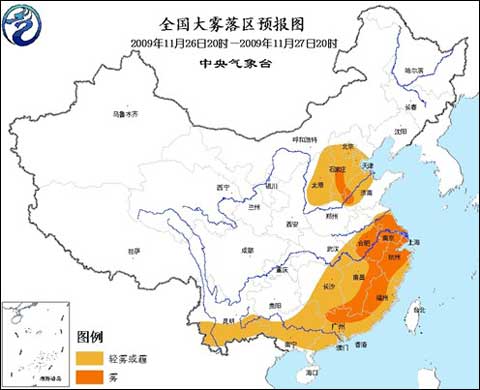 中央氣象臺2009年11月26日18時繼續發布大霧橙色警報: