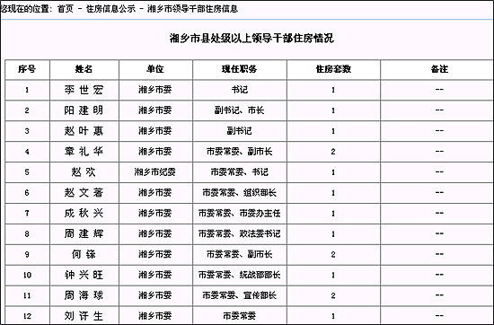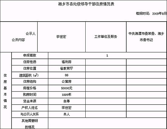 10月初,湘鄉(xiāng)市要求縣處級領(lǐng)導(dǎo)干部對住房情況進(jìn)行申報,申報內(nèi)容包括自建房、參與單位集資建房、購買福利房、經(jīng)濟(jì)適用房、商品房、租房、出賣和出租房屋的情況,以及住房所在地址、產(chǎn)權(quán)所有人、建筑面積和使用面積、房屋造價或價格、付款數(shù)額、資金來源等。