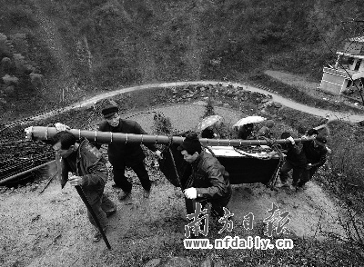 昨日下午,南方日?qǐng)?bào)記者承租了4輛汽車,輾轉(zhuǎn)鄉(xiāng)村摩的,最后坐輪渡過廖家坪水庫,艱難進(jìn)入山澗中的陰山排村時(shí),村落的峽溪邊哀樂低回,不到1米寬的泥漿路上擺滿黑色棺材,哭聲震徹湖南安化高明鄉(xiāng)連綿的群山。一片青綠下,大山下白衣素裹。