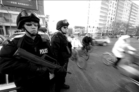 昨天上午,記者在西單文化廣場(chǎng)前看到,一輛武裝處突車(chē)閃爍著警燈停靠在路旁,兩名身著作戰(zhàn)服的特警隊(duì)員全副武裝,警覺(jué)地注視著長(zhǎng)安街附近的人流和車(chē)流。