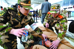 只要有傷員,羅愛華和戰友就用肩扛、用手抬,將傷者抬進大廳輸液、包扎……等待專機到來。13時50分,一名重傷女孩被醫療隊從車上接到候機大廳。羅愛華看到女孩因缺水嘴唇干裂、臉發青。她立即拿來礦泉水,一口一口喂到女孩嘴里。可能是太長時間沒喝水,女孩一口氣連喝十幾口。喝了近半瓶水后,女孩臉色開始好轉,并用感激的眼神打量這位阿姨。這時,接傷員的專機到達,女孩被抬上飛機。