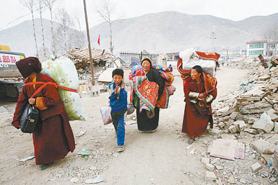 青海師范大學3年級學生伊西措毛是在15日凌晨兩點趕回玉樹的,但夜色并不能完全向她掩蓋地震造成的創傷。她路過結古鎮口塌掉的瑪尼堆,這是全世界最大的一個,曾讓玉樹人引以為傲;她路過勝利路和民主路交界的三叉路口,原先最繁華的商業中心已經被夷為平地;最后,她來到自己的家門口,這里保存著她從4歲開始的所有夢想。