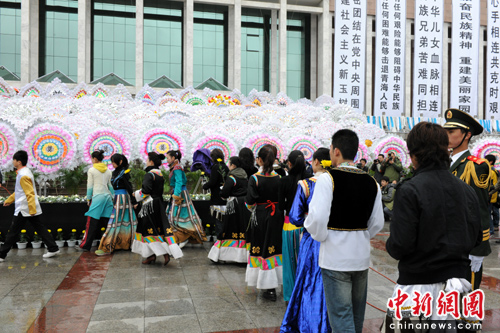 儀式在西寧最大的廣場新寧廣場舉行,在青海省博物館大樓上,高高懸掛著黑底白字橫幅“青海各族群眾深切哀悼玉樹遇難同胞”,橫幅下方的臺階上擺滿了花圈,一條條潔白的哈達懸掛在欄桿上。