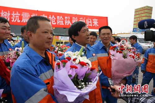 中新網成都4月26日電(記者劉忠俊)26日,國家電網四川省電力公司電力抗震救災搶險隊安全從地震災區玉樹返蓉。該支抗震救災搶險隊為玉樹災區送去了發電機、發電車以及電力搶險設備和救援物資,為玉樹災區災民安置區、學校復課提供了充足的電力保障。