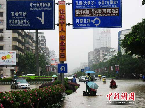 中新網(wǎng)韶關(guān)5月14日電(記者李凌)5月14日上午,一周前才遭受50年一遇洪災(zāi)肆虐的廣東韶關(guān)又遭暴雨襲擊,多個地點出現(xiàn)內(nèi)澇現(xiàn)象,特別是市區(qū)韶關(guān)大道、韶州賓館北出口,工業(yè)西大轉(zhuǎn)盤等7處水浸嚴(yán)重,導(dǎo)致交通中斷。