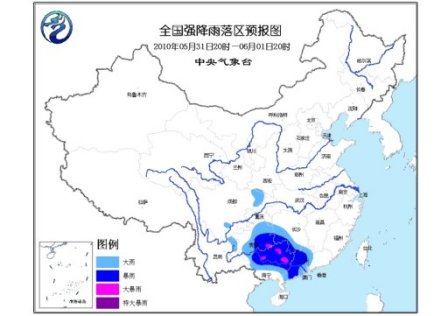 中新網5月31日電 中央氣象臺今日18時發布暴雨藍色預警:預計5月31日20時到6月1日20時,貴州中東部和南部、湖南西南部、廣西中北部、廣東中西部等地有大到暴雨,其中貴州東南部、廣西中北部等地的局部地區有大暴雨;上述部分地區還將伴有短時雷雨大風等強對流天氣。另外,四川盆地東北部、云南東北部等地的部分地區有大雨。