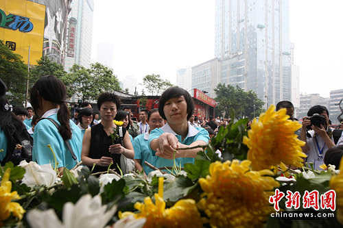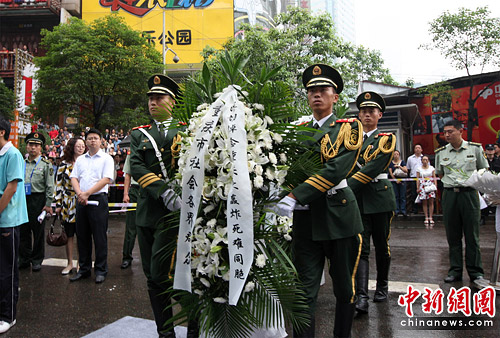 今天,重慶有500余名市民在“重慶大轟炸慘案隧道遺址”前敬獻鮮花,以紀念在“重慶大轟炸”中遇難的同胞。