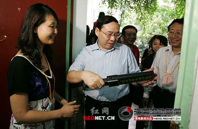 上午8時20分,梅克保在湖南省政府黨組成員、省教育廳廳長張放平,長沙市委副書記、市長張劍飛,省教育廳黨組成員、省教育考試院院長陳最華的陪同下,來到長沙市一中考點檢查,考生們正井然有序地通過安檢進入考室。梅克保仔細查看了考室外張貼的參考的學生信息,上面照片、準考證號、身份證號等一應俱全。