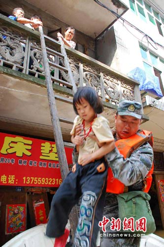 在一棟兩層高的老房子上,兩位老人焦急的招手呼喚救援,謝川江和戰友趕緊將沖鋒舟減速并靠近木樓。老漢姓胡,約有60來歲的樣子,看見解放軍來救援,老人的眼角濕潤了起來。等沖鋒舟停穩,老漢懸下一幅木梯,先將自己8歲的小孫女和14歲的孫子送上沖鋒艇,隨后再幫助58歲的老伴登上沖鋒艇。待3人坐穩以后,胡老漢輕聲的囑咐一聲“你們要注意安全”,隨后朝解放軍戰士揮手致謝。