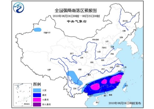 中新網6月24日電 中央氣象臺24日6時繼續發布暴雨黃色預警:預計,6月24日8時到6月25日8時,貴州南部、湖南中南部、江西大部、浙江中南部、福建、廣東大部、廣西等地有大到暴雨;廣西東北部、湖南東南部、江西中部偏東和中部偏西、浙江南部、福建中北部等地的部分地區有大暴雨。
