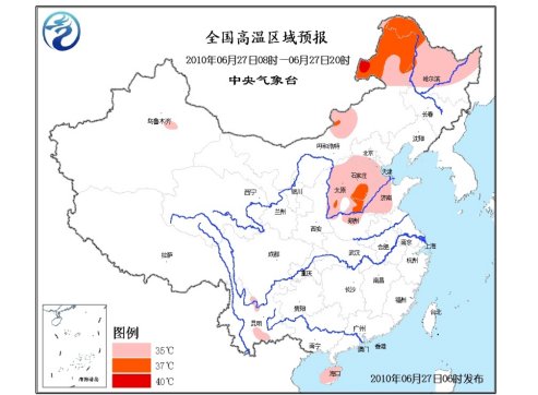 中新網6月27日電 中央氣象臺6月27日06時繼續發布高溫藍色預警:預計,今天白天,內蒙古東北部和中部的部分地區、黑龍江大部、山西大部、河北中南部、京津南部、河南北部、山東中西部、海南大部等地有35~37℃的高溫天氣,其中,內蒙古東北部、黑龍江西北部、河北南部等地局部最高氣溫可達38℃以上。