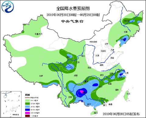 6月28日至29日,江南中北部、西南地區東部將有5~25毫米降雨,局部地區有30~60毫米,東北地區有3~15毫米、局部地區20~25毫米的陣雨或雷雨;