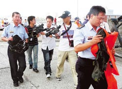 飛機失蹤后,臺空軍全力搜救,直升機首先在貓嶼北方0.6海里處發現大范圍不明油污,巡防艇又在該處尋獲印有“雙前”編號15211的鋁合金傘箱,內置的橘色飛行傘已脫離,傘廂破裂變形。此后,搜救隊在貓嶼1海里處再尋獲自動救生背心及外覆外包,救生背心上寫著編號OC○○1,救生衣無明顯損壞。