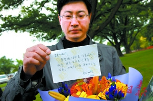 陳先生還特意買了兩束鮮花,其中一束粉紅色的玫瑰是他補送的情人節鮮花,他在寫給妻子的留言中說:“這次你要永遠留著,不要再扔垃圾桶了。”