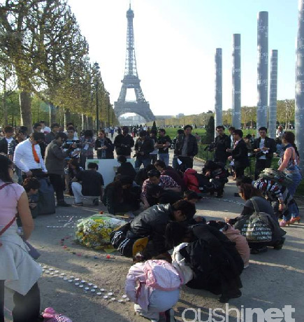 數(shù)百名在法留學(xué)生和華人于18日在巴黎艾爾菲鐵塔前的和平墻點起蠟燭,為青海玉樹地震的遇難者祈福。他們將數(shù)百支蠟燭擺成巨大的心形和“玉樹”字樣,然后逐一將蠟燭點燃,與此同時,祈福板上也留下他們各式的祝福語,表達(dá)自己對災(zāi)區(qū)同胞們血脈相連的感情。望著燃燒的蠟燭,留學(xué)生和華人高呼“玉樹加油”,衷心的祈求青海玉樹地震中的生者平安,死者安息。活動吸引不少路過的法國人和游人也停下腳步,為玉樹地震的死難者哀悼。