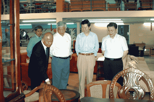 馬儒沛首先來到巴拿馬家具城,受到潘文亮董事長和他兩位兒子的熱情接待,馬儒沛參觀了面積達九千多平方米的店面,深感驚嘆,他詳細地向潘文亮詢問了關于家具市場的開發、廠房擴建、創立自主品牌、原材料成本等方面的問題。