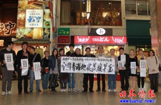 災(zāi)情就是命令!災(zāi)難無情,人間有愛!4月22日(星期四),愛媛松山一大早下起了多年未見的瓢潑大雨,但愛媛縣的同胞和日本友人仍然按照約定的時間,冒著大雨毅然走上街頭,開始了由聯(lián)合會帶頭部署倡導的聲勢浩大的街頭募捐活動。由三十多人組成的募捐隊伍,彼此不分中國人還是日本人,用真心與熱情共同譜寫、詮釋人間大愛——心向玉樹,情系災(zāi)區(qū)!四幅由聯(lián)合會副會長、旅日山水畫家牛子華即時揮毫寫就的《愛媛縣華僑華人聯(lián)合會 中國留學生學友會 日中友好協(xié)會:為中國青海地震義援募金》的巨大橫幅在指定地點拉開了,募捐隊伍懷抱著十多個由聯(lián)合會事務(wù)局準備的專用募捐箱,拉開了活動的序幕。“拜托為中國青海地震災(zāi)區(qū)獻愛心”的募捐聲,聲聲入耳。向來對救災(zāi)特別熱情的日本國民開始駐足慷慨解囊……和兩年前祖國汶川大地震賑災(zāi)募捐情景同樣感人的一幕再次在同一地點重新演繹。我們禁不住熱淚盈眶——祈福災(zāi)區(qū)人民!衷心感謝熱情、善良、友好的人們!第一天共募集到58,700日元。