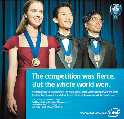 英特爾在廣告中的標(biāo)題及內(nèi)容都很簡單。標(biāo)題為“科學(xué)獎(jiǎng)競(jìng)爭激烈,贏家是全世界。”廣告內(nèi)容指出,恭賀所有在英特爾科學(xué)獎(jiǎng)的優(yōu)勝者及進(jìn)入最后準(zhǔn)決賽參賽者,他們創(chuàng)造了更光明的未來。