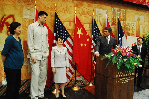 中新網4月28日電 據美國《美中信使報》報道,中國駐休斯頓總領事高燕平與美國德克薩斯州州長里克.佩里于當地時間27日下午5時在總領館會議大廳舉辦“慶祝上海世博會和中國-得州友好關系”招待會。擔任上海世博會形象大使的中國著名籃球明星姚明和他的妻子葉莉以及當地華人僑領及學界代表200余人應邀出席招待會。