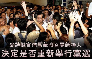 中新網10月16日電 據馬來西亞《星洲日報》報道,馬華總會長翁詩杰15日宣布,他已指示馬華總秘書王弗明,根據黨章第30.1條款召開特別代表大會,議決是否重新選舉,讓中央代表們在特大/常年代表大會上,決定是否要重新選任中央委員,以終結目前的僵局。
