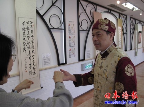 這位濃眉大眼的大漢,是湖南岳陽(yáng)人,眉宇間有一股坦蕩之氣逼人。總讓筆者懷疑是武林中人。就是這位,自2001年來(lái)日本傳播指書(shū)文化,短短10年間,已是列島上下,上至國(guó)家政要,下至普通市民,爭(zhēng)相結(jié)交的人氣者。