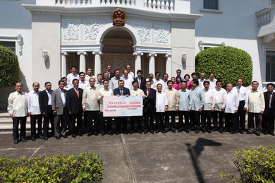 菲律賓商聯總會理事長黃禎潭、菲華各界聯合會主席戴宏達一行4日上午來到中國駐菲使館,親手向劉建超大使遞交了由這兩個菲華社團發動當地華人華僑為玉樹災區籌得的善款3287.7萬比索(約合500萬元人民幣)。