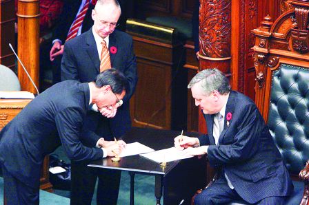 中新網(wǎng)11月1日電 據(jù)加拿大《明報》報道,競選連任成功的加拿大安省省長麥堅迪10月30日率領(lǐng)新內(nèi)閣宣誓就任。華裔省議員陳國治再上層樓,被麥堅迪委以重任,出任安省公民及移民廳廳長,成為安省內(nèi)閣的一名重要成員。陳國治在宣誓就任的儀式結(jié)束后向中文媒體表示,感謝省長給他這個機會,可以為安省的新移民、新公民服務(wù)。