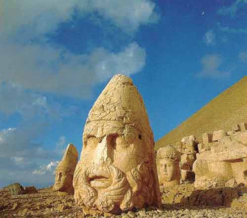 人像山是我自己編的名字,它的音譯應該為內姆魯特山。有些臺灣旅游書上把它叫作人頭山,聽著很是恐怖。雕像佇立在海拔2150米高的內姆魯特山頂,這里其實是科瑪吉內的國王安提俄克斯一世的陵墓。在這個英俊的國王的陵墓前面,列著他喜愛的神明雕像,他自己的雕像也擠身其中。我想,他是希望自己死后能入“仙班”,或者說,他本就是神……
