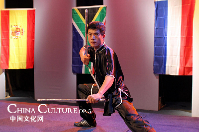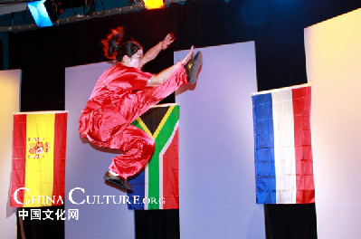 中國文化中心武術隊表演了南拳、長拳和三節棍等項目。他們在鏡頭前全神貫注、一絲不茍,最大程度地把自己所學完美地呈現給電視機前的觀眾。南拳套路短小精悍,結構緊湊,手法多變,步法穩健,并以聲助威,威猛迅疾,靈巧綿密,上肢及手型尤其富于變化;長拳套路姿勢舒展大方,動作靈活快速,剛柔并濟,快慢相間,動靜結合,節奏分明,并帶有跳躍、跌撲和滾翻動作,非常精彩;而三節棍則是伸縮自如,三節相互轉換,方法多變,遠近兼顧,動作兇猛敏捷,氣勢逼人。棍法有劈、掃、掄、擊、戳、絞、格以及各種舞花,變幻無窮,令人驚嘆。這三個項目是文化中心的保留節目,深受武術學員們的喜愛。