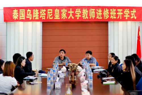中新網10月11日電 據華僑大學華文學院網站消息,10月11日上午,泰國烏隆塔尼皇家大學教師團開學式在華僑大學華文學院一號樓會議室舉行。華文學院副院長陳旋波、培訓部主任李金鈔等出席了開學式。