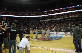中場休息期間在全場觀眾經久不息地助威聲下,費佛爾大學孔子學院邀請的4位功夫大師由愛美麗·羅德女士率領步入球場中央,功夫大師們恭謹地向全場觀眾行佛禮。這時賽場主持人以NBA式的渾厚嗓音向現場觀眾發布: “讓我們熱烈歡迎今晚的特別嘉賓,費佛爾大學孔子學院少林功夫大師,他們給我們帶來了擁有1700年歷史的中國地道的少林功夫。”