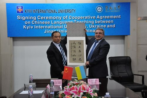 受校長胡軍的委托,暨南大學副校長賈益民于9月29日下午代表學校與烏克蘭基輔國際大學校長哈恰圖良簽署了兩校漢語教學合作協議書。在簽字儀式上,賈益民向來賓介紹了暨大的辦學情況,并講解了該校在辦學過程中形成的一整套,從教學、科研、教材編寫到海外教育項目開發的對外漢語教學辦學體系,暨南大學很樂意以優質的教學資源為有需要的國家提供漢語教學支持。哈恰圖良對暨大的熱情接待表示感謝,他盛贊中國是一個具有悠久歷史和文化傳統的偉大國家,漢語熱在世界范圍內的興起就是最好的佐證。目前烏克蘭對漢語的需求很旺盛,學習漢語的人也越來越多,希望暨南大學在教學、師資等方面給予支持,全力推動烏克蘭的漢語教學工作。雙方簽署正式協議后將在建立漢語教學點、聯合培養研究生、互相協助招生等方面開展實質性合作。