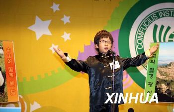 10月10日,在韓國首都首爾舉行的第二屆小學(xué)生漢語演講比賽上,樸焌汎小朋友在講述自己對中國美麗風(fēng)景和大熊貓的向往。當(dāng)日,由韓國現(xiàn)代中國研究會和韓國HSK實施委員會主辦、首爾孔子學(xué)院主管的第二屆小學(xué)生漢語演講比賽在首爾舉行。來自韓國各地的30多名小學(xué)生經(jīng)過激烈的角逐進(jìn)入決賽。(新華社/何璐璐 攝)