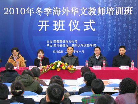 中新網1月6日電 據四川僑網消息,1月6日,由國務院僑辦文化司主辦,四川省僑辦和四川大學承辦的2010年冬季海外華文教師培訓班在四川大學開班。這是四川省僑務系統首次承辦海外華文教師培訓班。四川省僑辦副主任吳振西、四川大學文學與新聞學院院長曹順慶出席開班儀式并致辭。四川大學文學與新聞學院黨委書記熊蘭主持儀式。